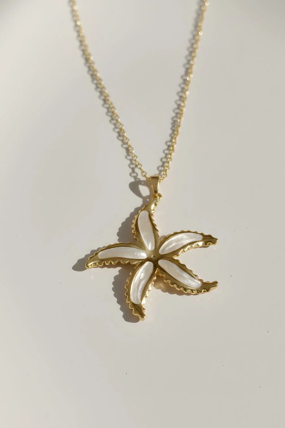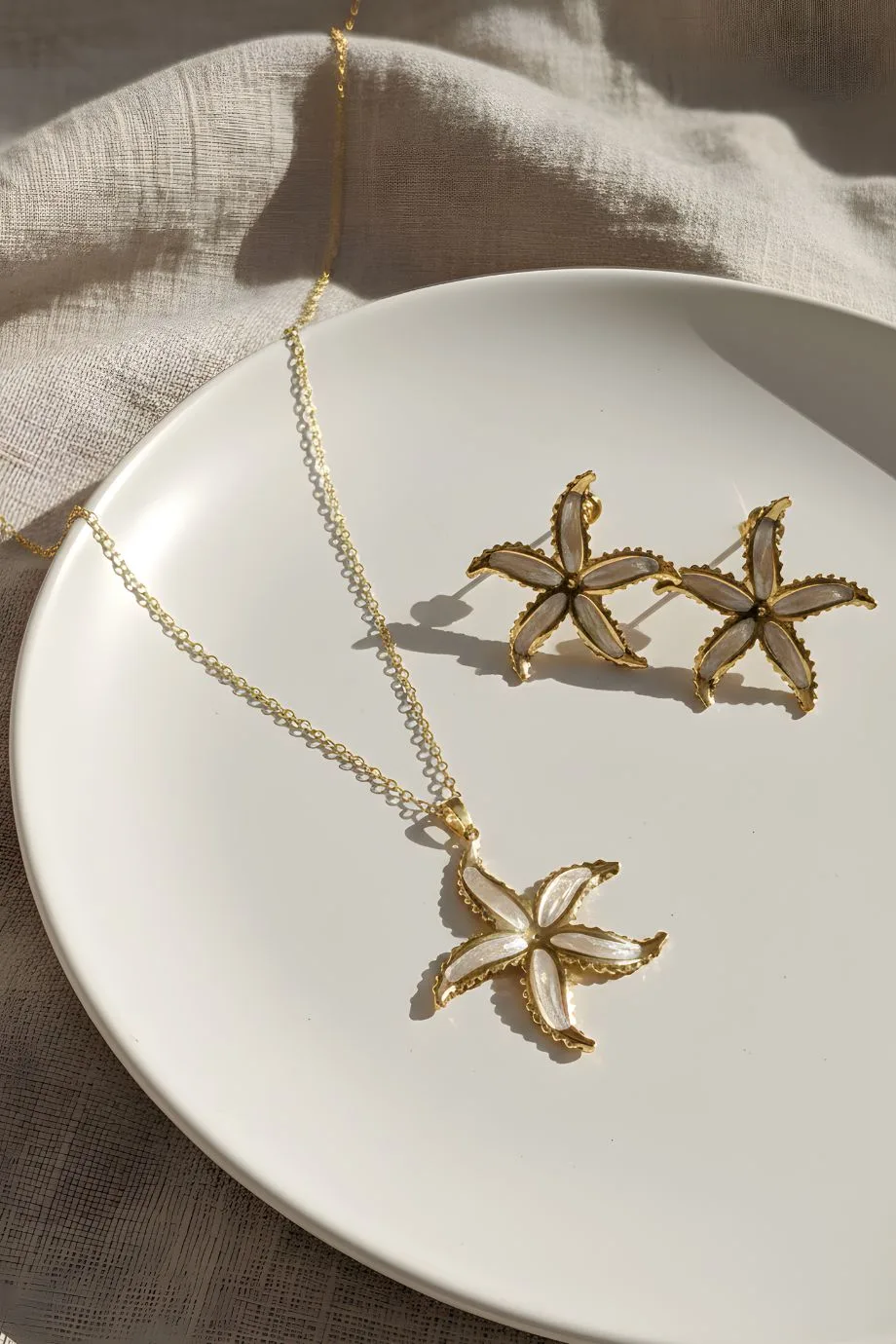 Categories:Classic JewelryPendant Set Tags:Aesthetic Earrings, Celestial Bloom Necklace, Classic Jewellery, Ethereal Jewelry, Flower Pendant Set, Gold Starfish Necklace, mother-of-pearl jewellery, Pearl Inlay Jewelry Brand: BelleFaux