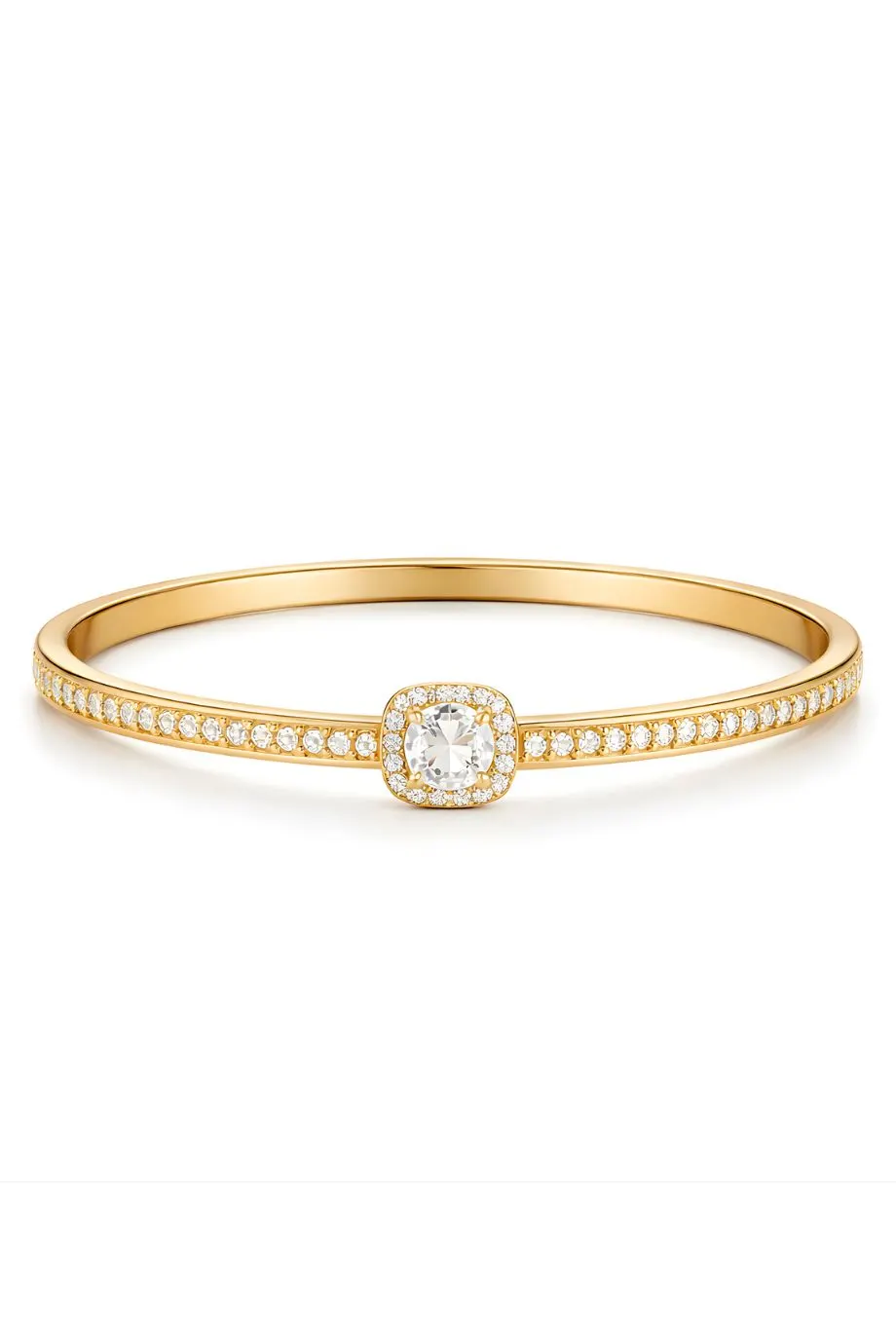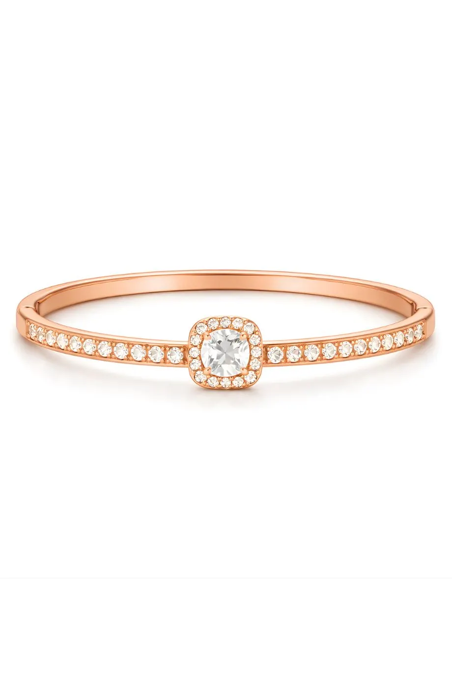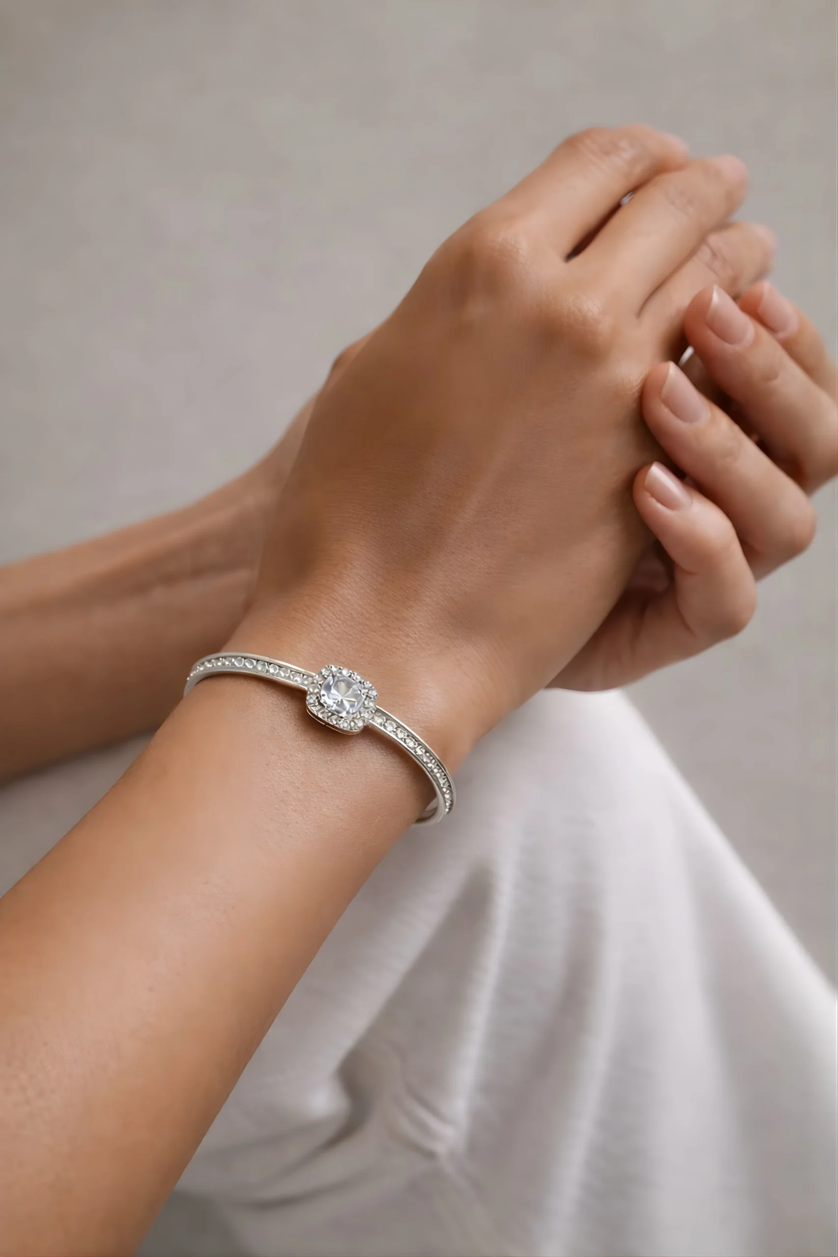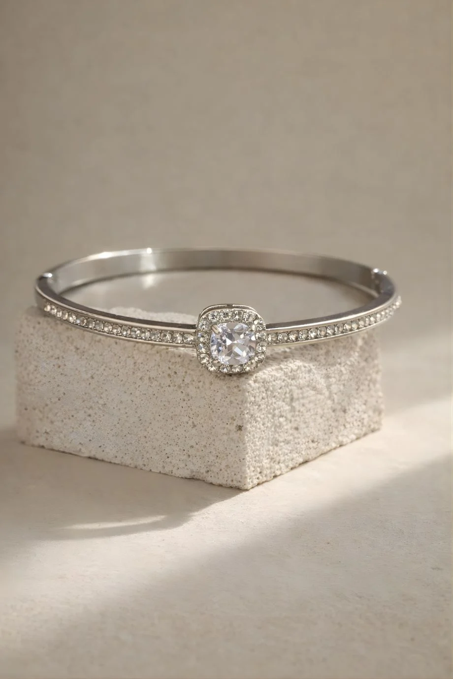The Crystal Crest Bracelet, a refined piece designed to celebrate brilliance in its purest form. Crafted with a sleek silver-toned band, this bracelet features a striking central crystal framed by a delicate halo of shimmering stones, creating a radiant focal point that captures light with every movement.