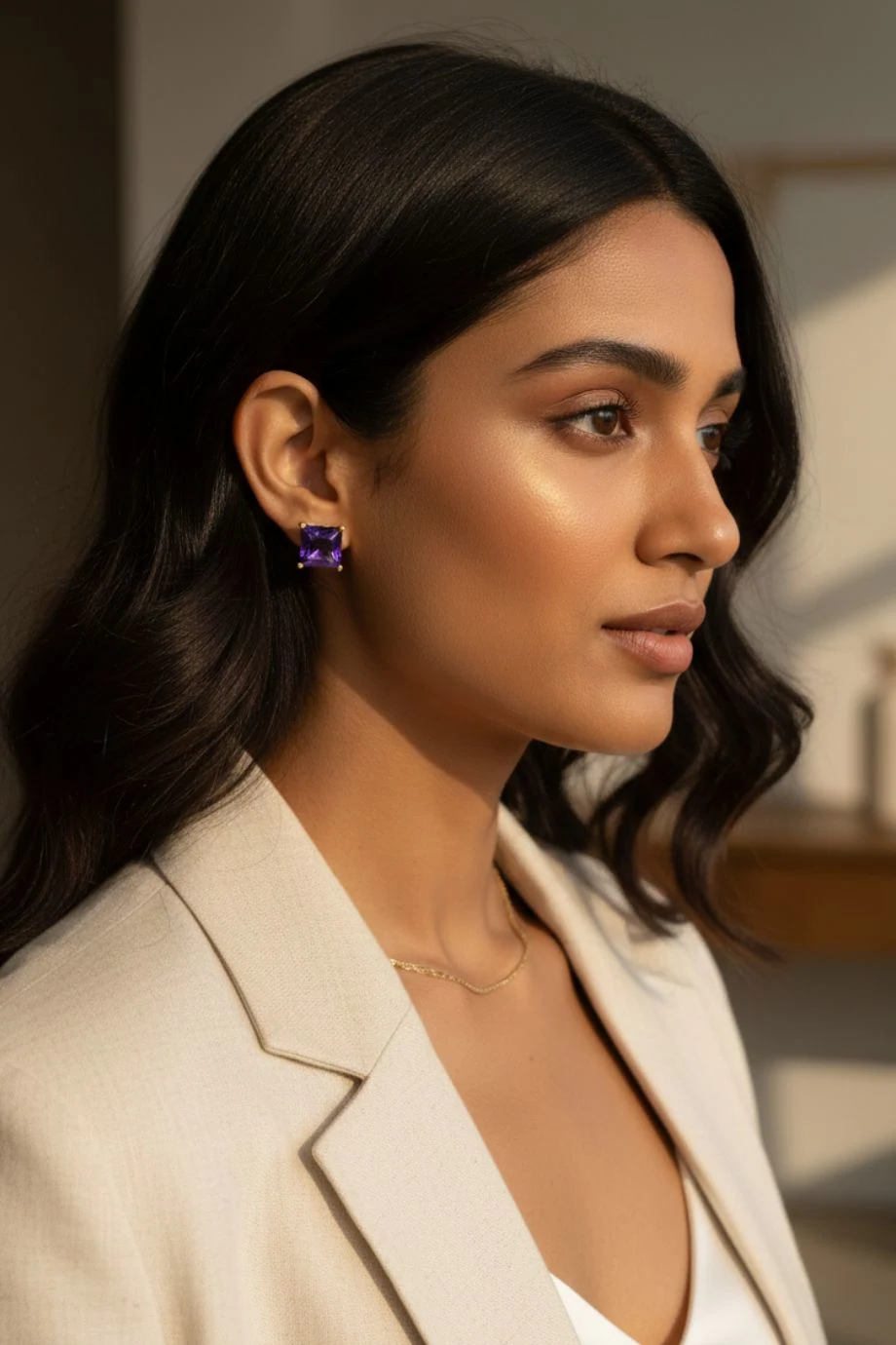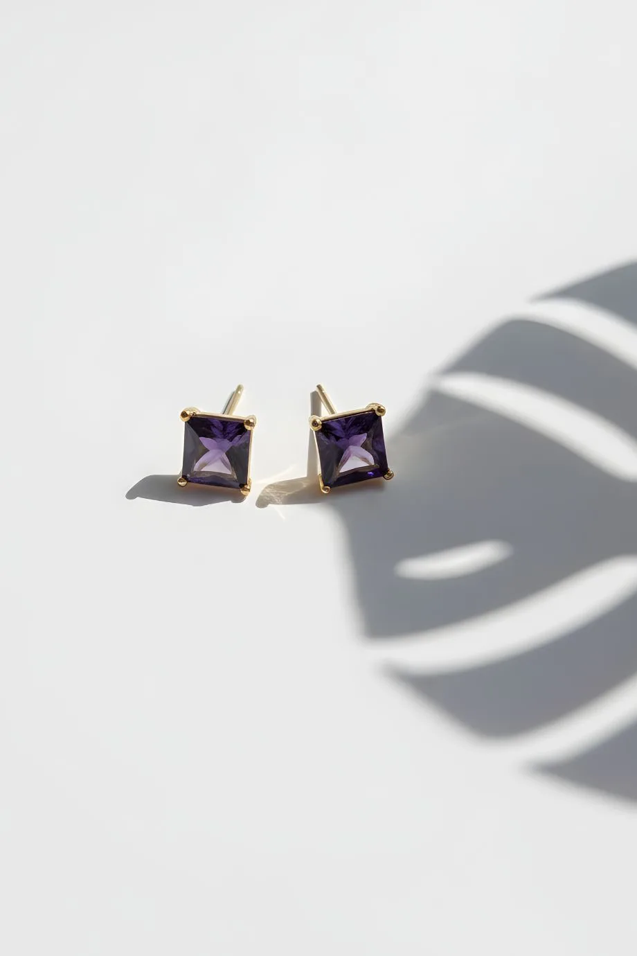 Experience the perfect blend of royal color and contemporary design with the Purple Aura Stud Earrings. These striking studs feature a deep, amethyst-toned crystal, precision-cut into a sharp square princess silhouette to maximize light refraction and depth. Each stone is securely held in a classic four-prong setting of polished gold-toned alloy, providing a warm contrast to the cool intensity of the purple hues.
