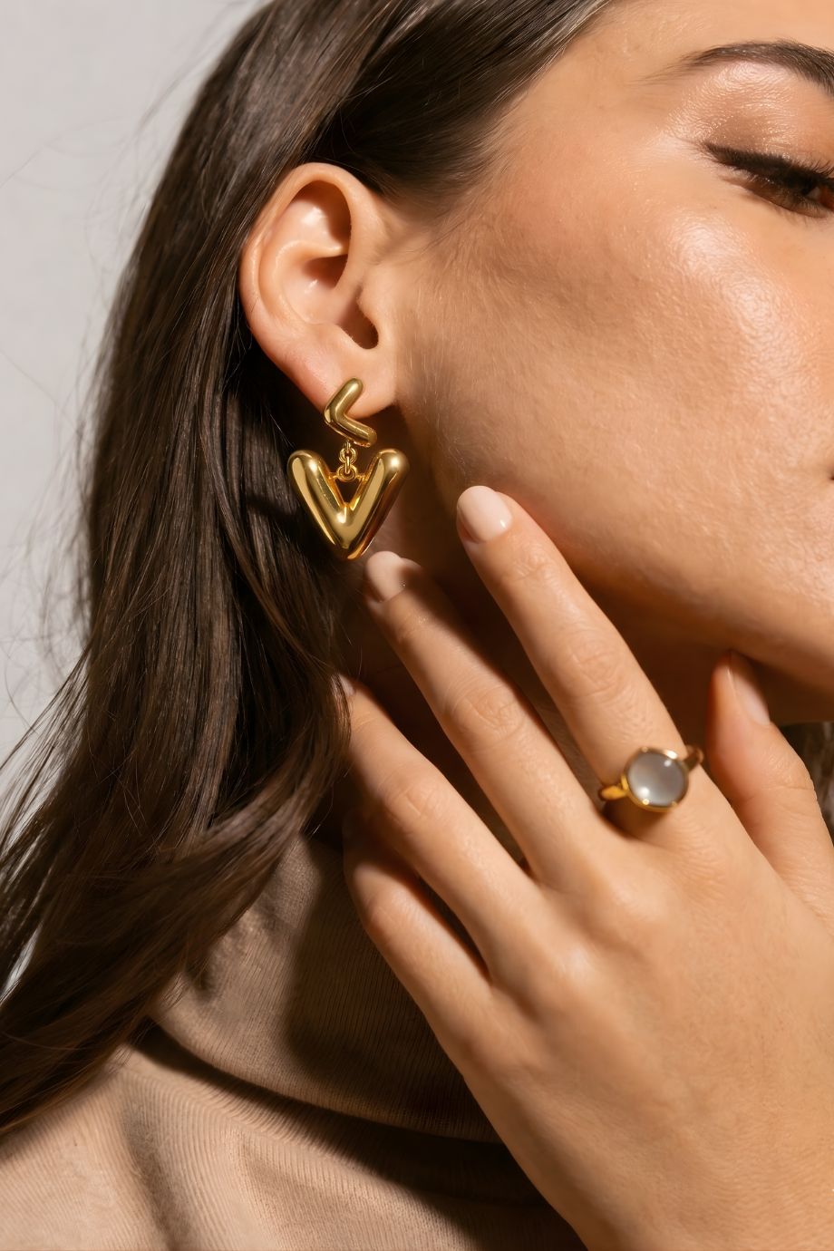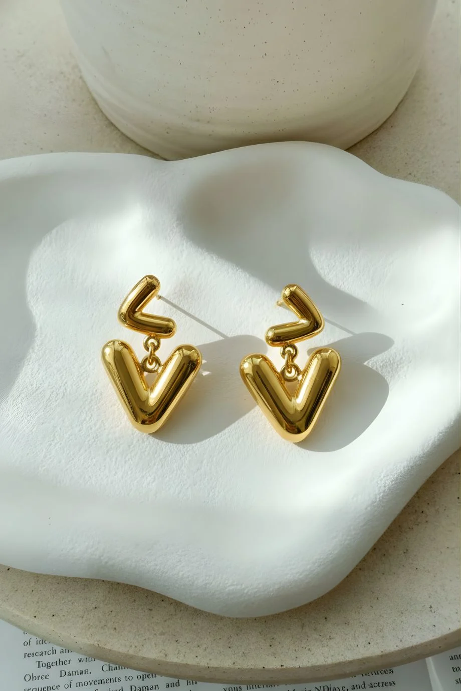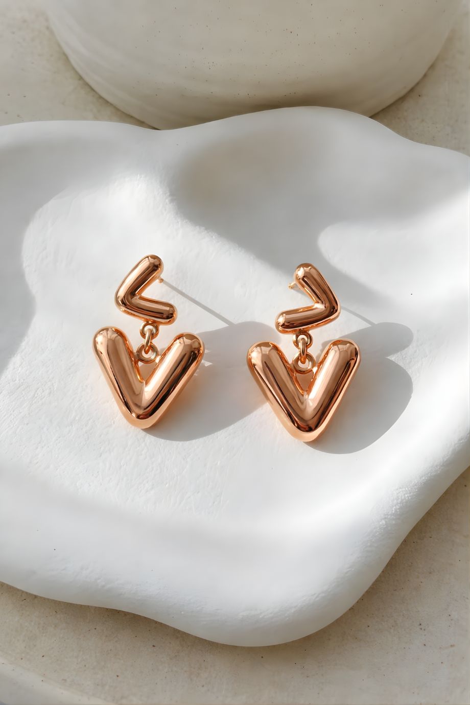 Bold yet playful, the Sculpted Love Dangles Earrings are a modern expression of affection and style. Designed with smooth, sculpted “V” shapes that gracefully connect, these earrings create a flowing silhouette that symbolizes connection, confidence, and contemporary charm. The glossy gold-toned finish enhances the soft curves of the design, giving the earrings a polished, dimensional look that catches light beautifully. Their minimal yet artistic structure makes them stand out while remaining effortlessly wearable.