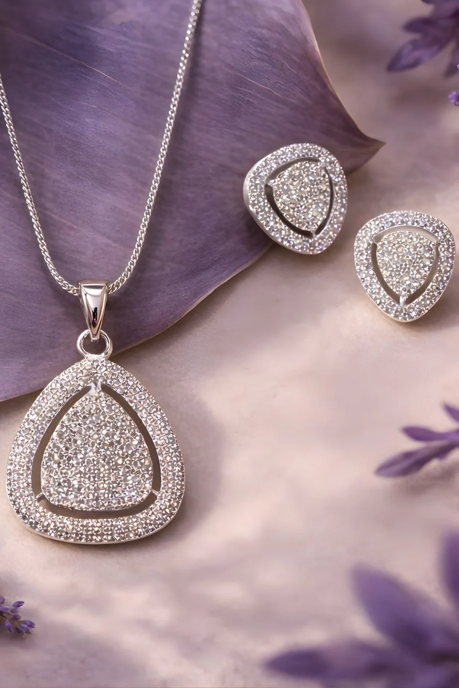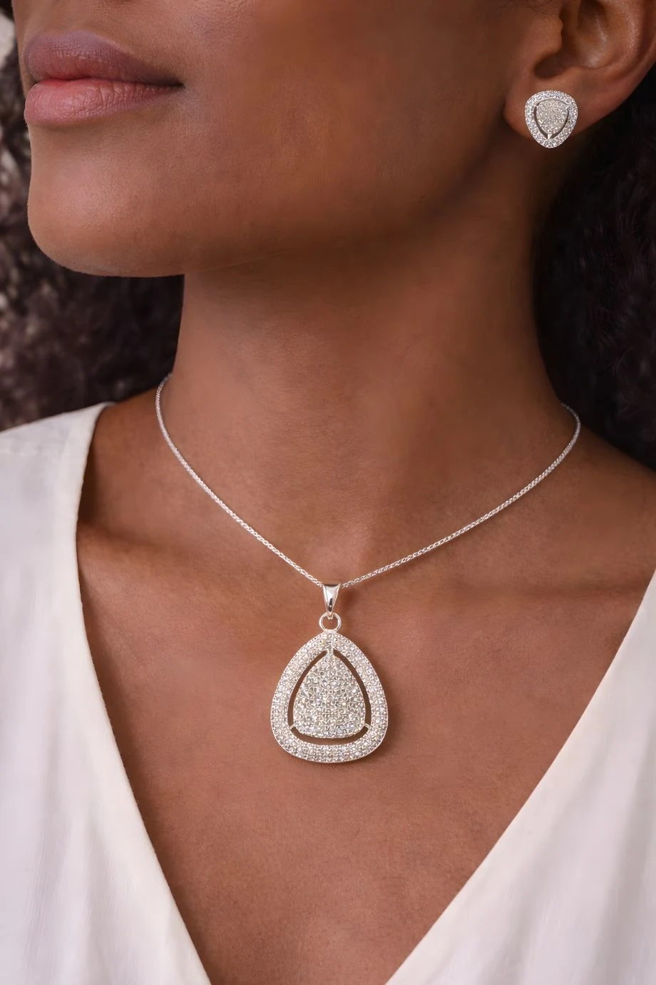The perfect mix of minimal glam and statement energy. Designed with a sleek triangle pendant covered in dazzling diamond-like stones, this piece catches the light from every angle and instantly elevates any outfit. Layer it, style it, or let it shine on its own — this set is made for moments when you want to look effortlessly iconic.