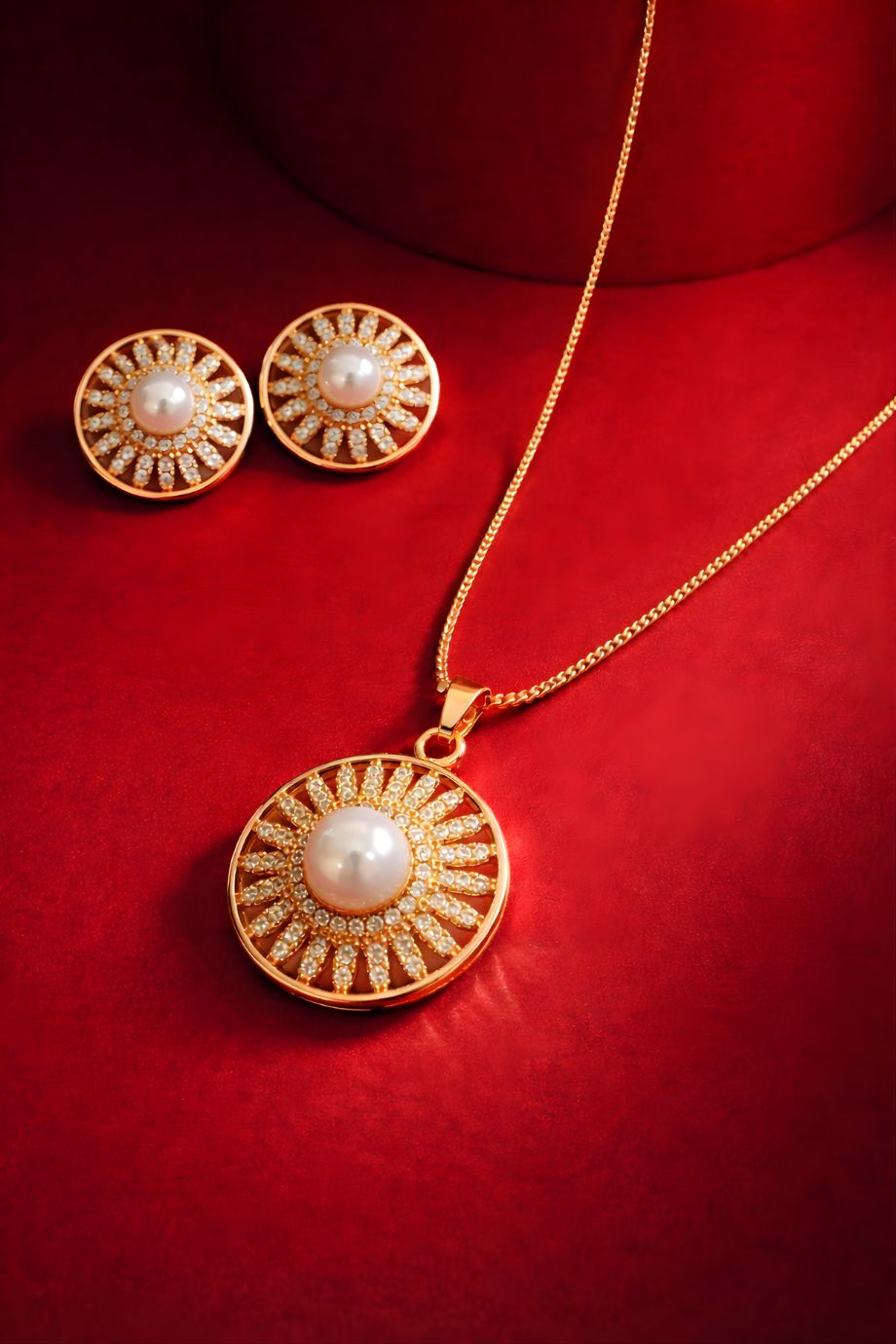 Designed to stand out, this stunning set features a radiant sunburst-inspired pendant with a glowing pearl at the center, surrounded by sparkling stones that catch the light from every angle. The warm gold-tone finish adds the perfect touch of luxury while keeping the look effortlessly stylish. Wear it. Glow in it. Own the moment. 🌟
