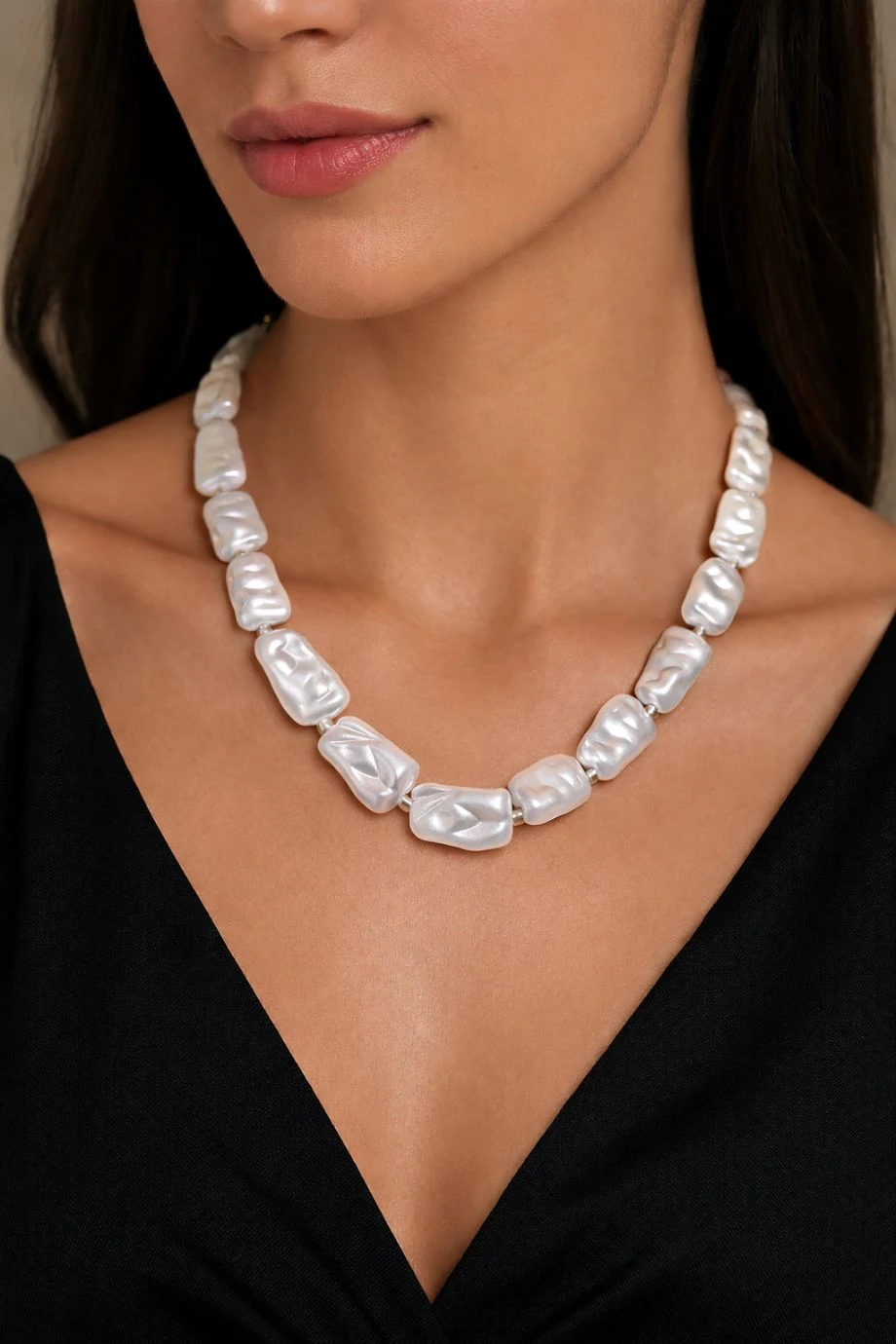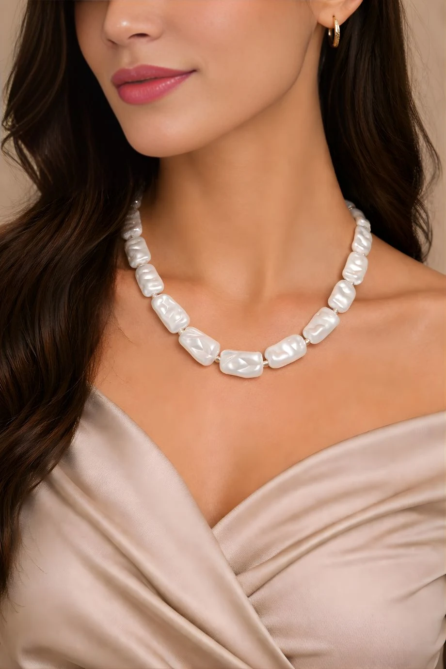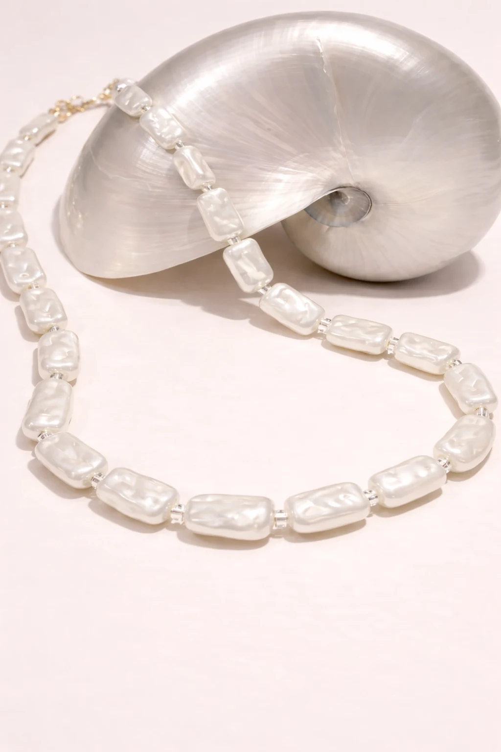 The Uncut Fleet Pearl Necklace is a bold reinterpretation of classic pearl jewelry, celebrating the beauty of organic imperfections. This statement piece features a collar-length strand of oversized, baroque-inspired “uncut” pearls. Each rectangular-profile pearl is uniquely textured with a high-luster, iridescent finish, separated by minimalist gold-toned spacer beads for a structured yet fluid drape.
